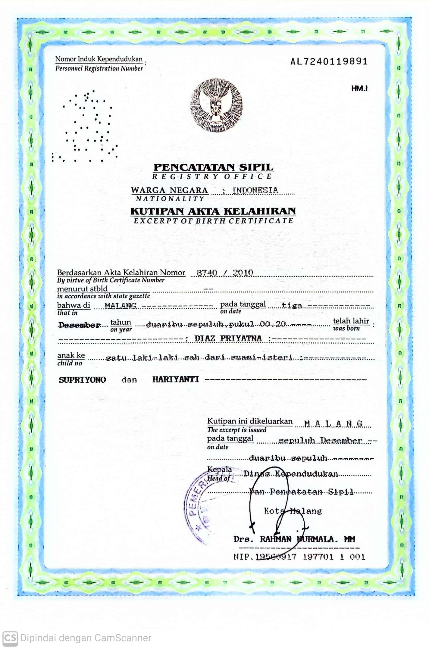 Akta Kelahiran :