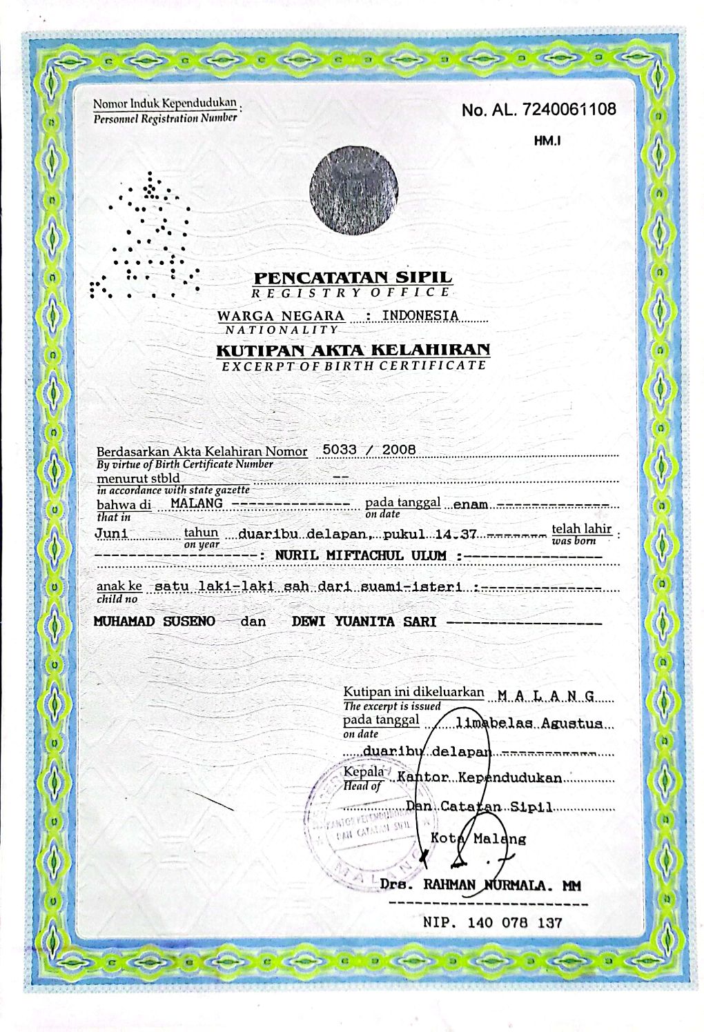 Akta Kelahiran :